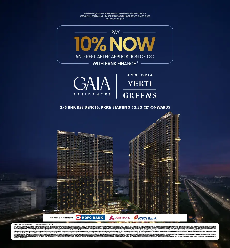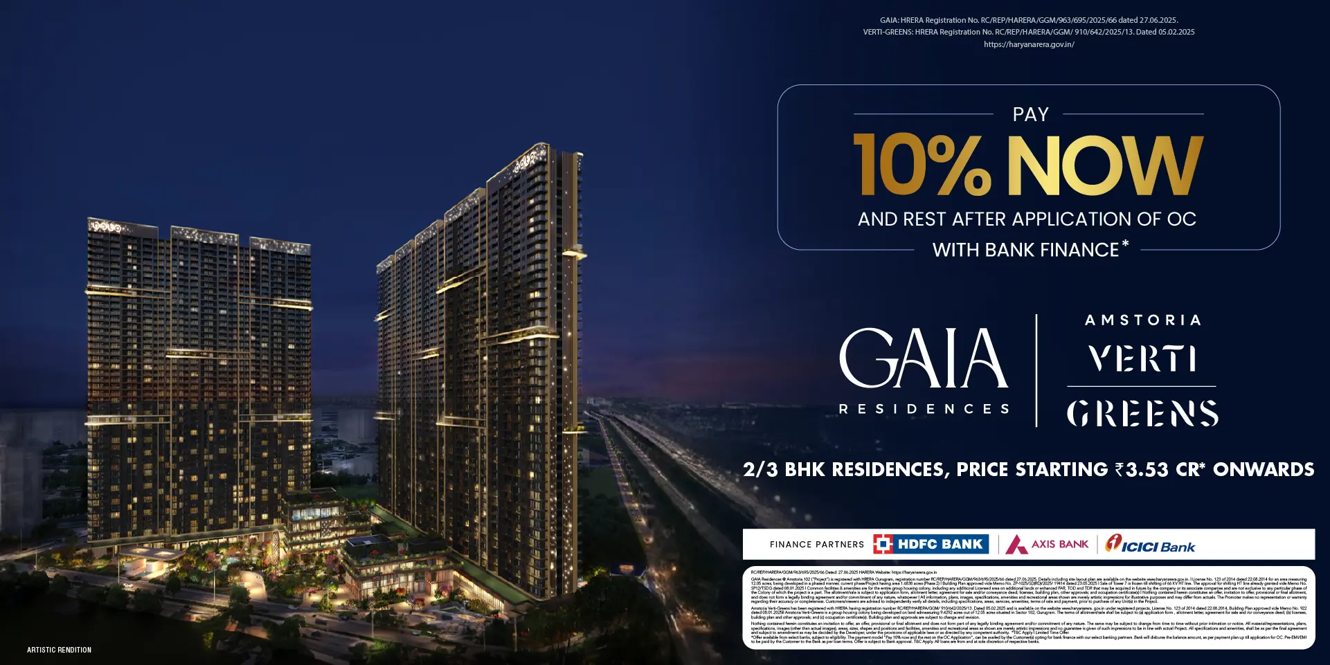 GAIA Residences @ Amstoria 102 (“Project”) is registered with HRERA Gurugram, registration number RC/REP/HARERA/GGM/963/695/2025/66 dated 27.06.2025. Details including site layout plan are available on the website www.haryanarera.gov.in. | License No. 123 of 2014 dated 22.08.2014 for an area measuring 12.05 acres, being developed in a phased manner, current phase/Project having area 1.6838 acres (Phase 2) | Building Plan approved vide Memo No. ZP-1025/SD(RD)/2025/ 19414 dated 23.05.2025 | Sale of Tower 7 is frozen till shifting of 66 KV HT line. The approval for shifting HT line already granted vide Memo No. SP12/TSDG dated 08.01.2025 | Common facilities & amenities are for the entire group housing colony, including any additional licensed area on additional lands or enhanced FAR, TOD and TDR that may be acquired in future by the company or its associate companies and are not exclusive to any particular phase of the Colony of which the project is a part. The allotment/sale is subject to application form, allotment letter, agreement for sale and/or conveyance deed; licenses, building plan, other approvals; and occupation certificate(s) | Nothing contained herein constitutes an offer, provisional or final allotment, and does not form a legally binding agreement and/or commitment of any nature, whatsoever | All information, plans, images, specifications, amenities and recreational areas shown are merely artistic impressions for illustrative purposes and may differ from actuals. The Promoter makes no representation or warranty regarding their accuracy or completeness. Customers/viewers are advised to independently verify all details, including specifications, areas, services, amenities, terms of sale and payment, prior to purchase of any Unit(s) in the Project.