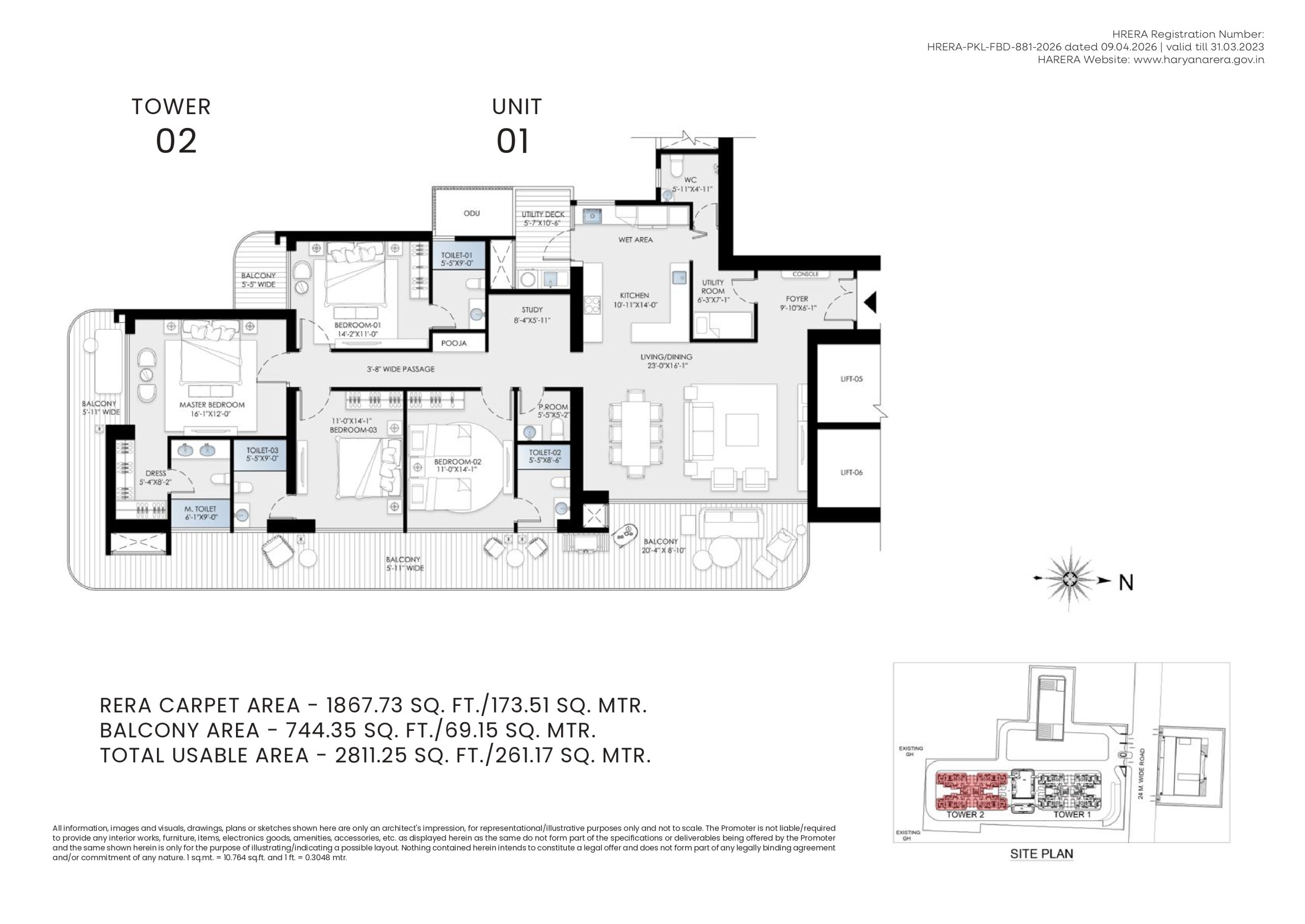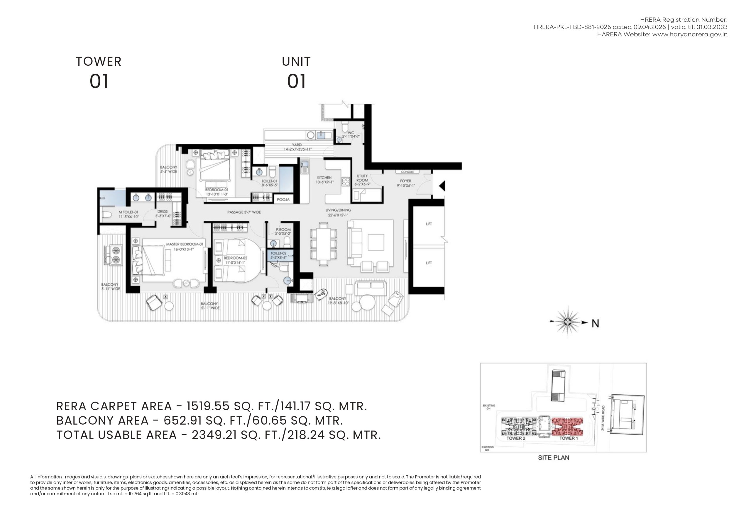 SkyNest Towers (“Project”) is registered with HRERA Panchkula, vide registration number HRERA-PKL-FBD-881-2026 dated 09.04.2026. The details for the aforesaid Project including approved layout plans are available on the website www.haryanarera.gov.in. | License No. 44 of 2008 dated 07.03.2008 | Building plans are approved by the competent authority as per applicable regulations. The allotment/sale is subject to application form, allotment letter, agreement for sale and/or conveyance deed; licenses, sanctioned building plans, other approvals, and occupation certificate(s) | Nothing contained herein constitutes an offer or invitation to offer, provisional or final allotment, and does not form a legally binding agreement and/or commitment of any nature whatsoever. Recipients are advised to use their discretion in relying on the information/data described/shown therein. All information, designs, dimensions, facilities, visuals, drawings, plans, sketches, images, specifications, amenities, furniture, accessories, paintings, items, electronic goods, additional fittings/ fixtures, decorative items, false ceiling including finishing materials, shades, sizes and colour of the tiles and other details and recreational areas shown are merely artistic impressions for illustrative purposes only and may differ from actuals. Heights mentioned are approximate and not to scale. All specifications and amenities shall be as per the final agreement executed with the Promoter. The Promoter makes no representation or warranty regarding their accuracy or completeness. Customers/viewers/ recipients are advised to independently verify all details, including specifications, areas, services, amenities, terms of sale and payment, prior to purchase of any unit(s) in the Project. *The area for amenities shall mean to include (i) the area earmarked for club and primary school and the applicable FAR allowed on such sites by DTCP as per the sanctioned drawings; and (ii) the landscape area, which shall mean to include the soft and hard landscape area forming part of the project on the ground and podium level (if any).